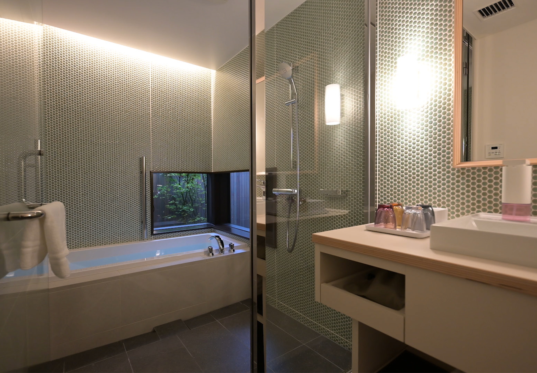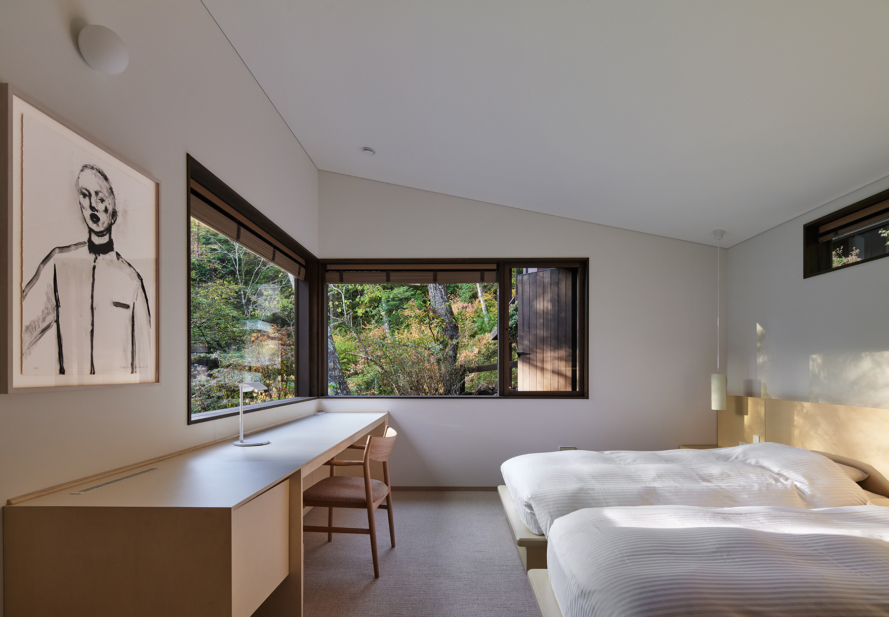 特注家具には汎用品の積層合板を使用したほか、敷地内で伐採せざるを得なかった樹木を材料とするなど素材そのものの魅力にフォーカスした。