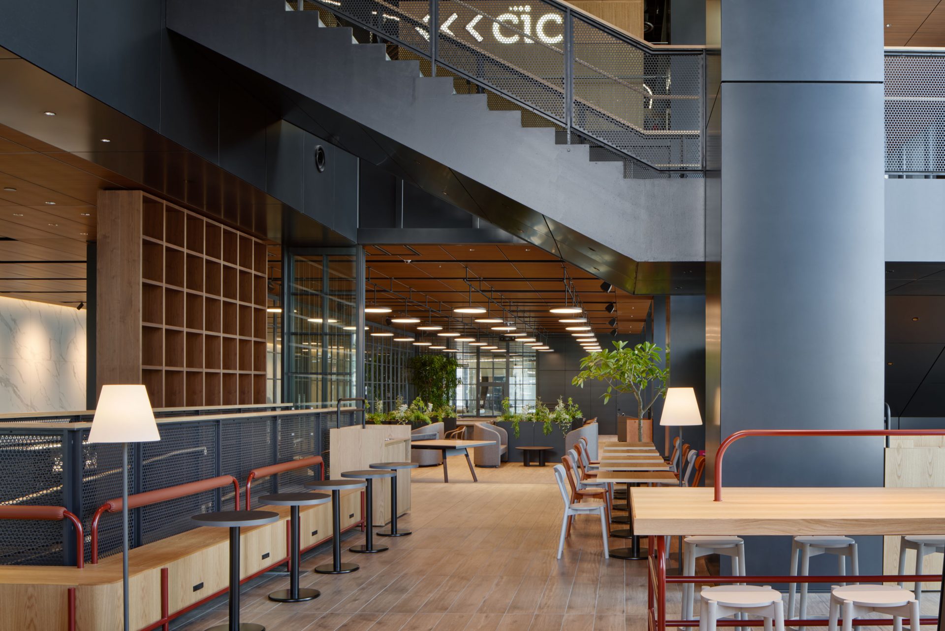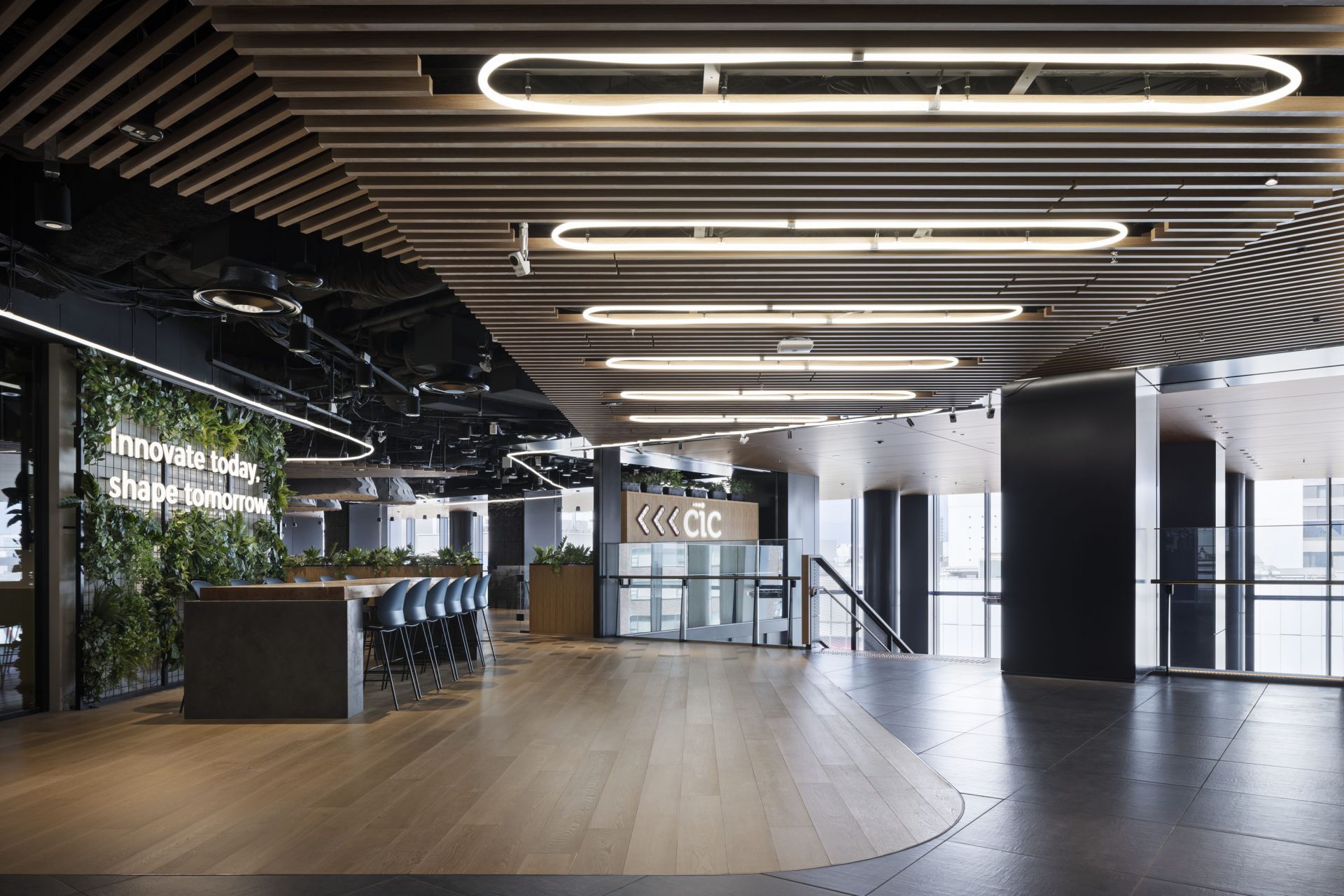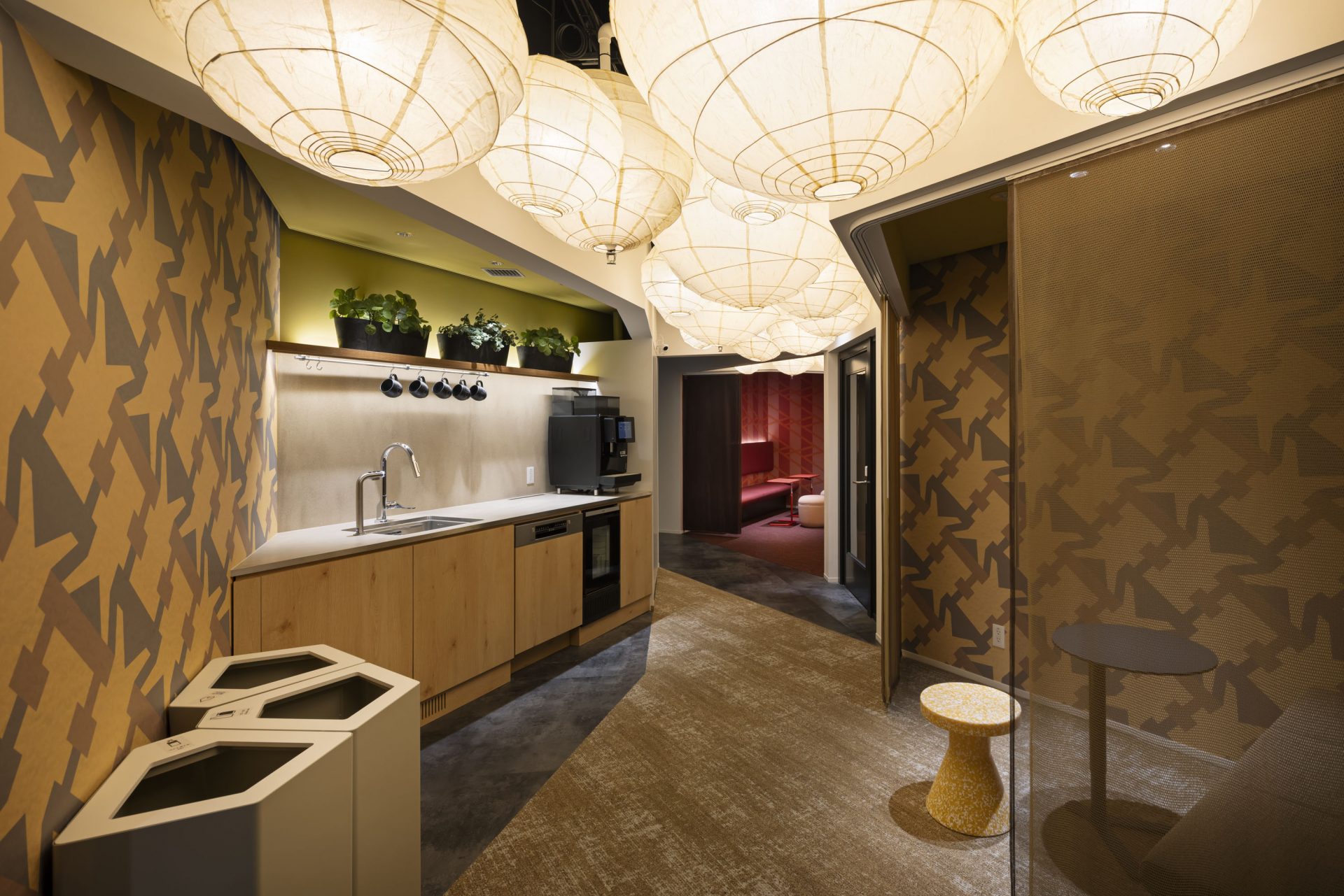 ビルコンセプトである「創造交差点」を体現するエリアのインテリアデザイン。