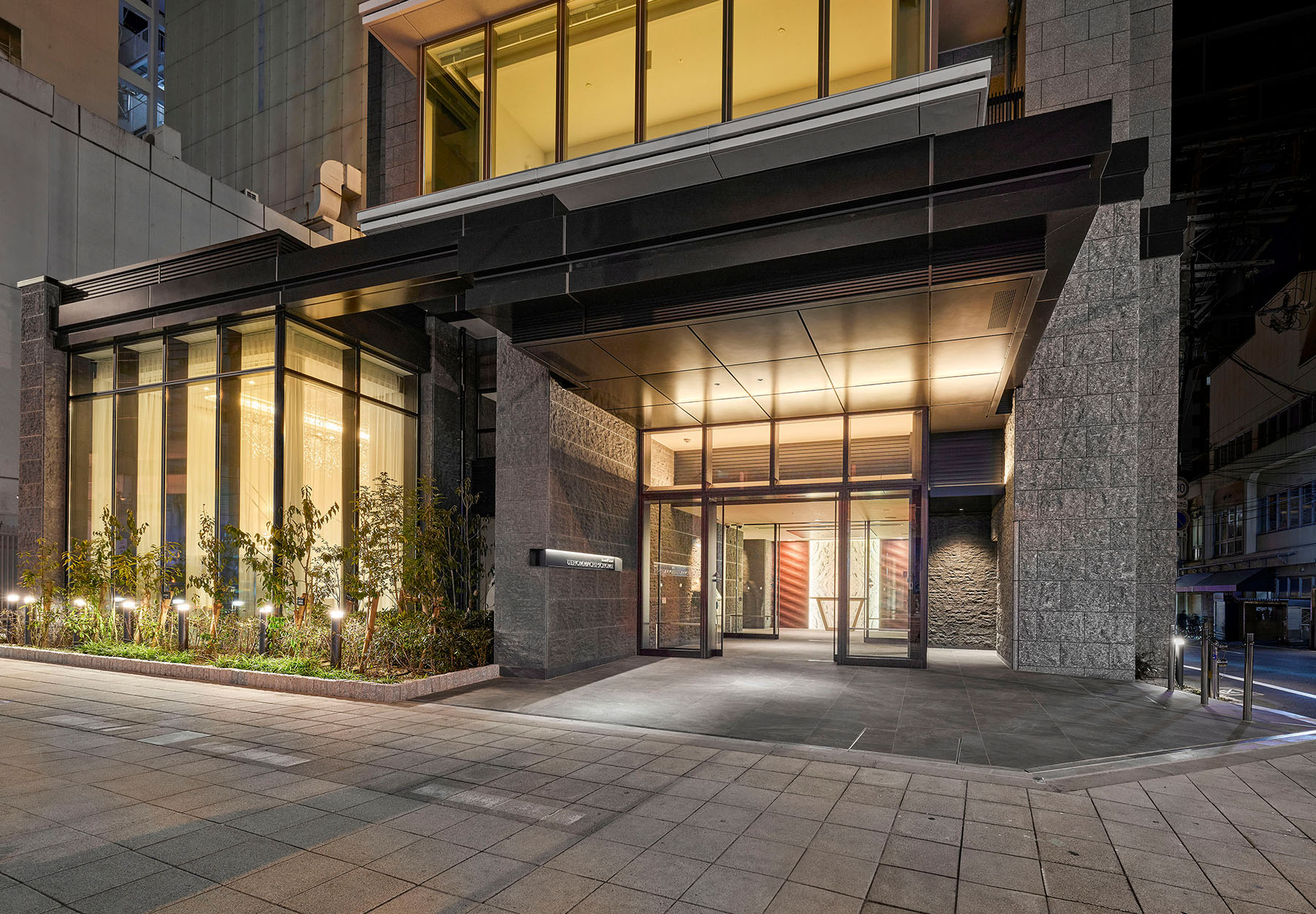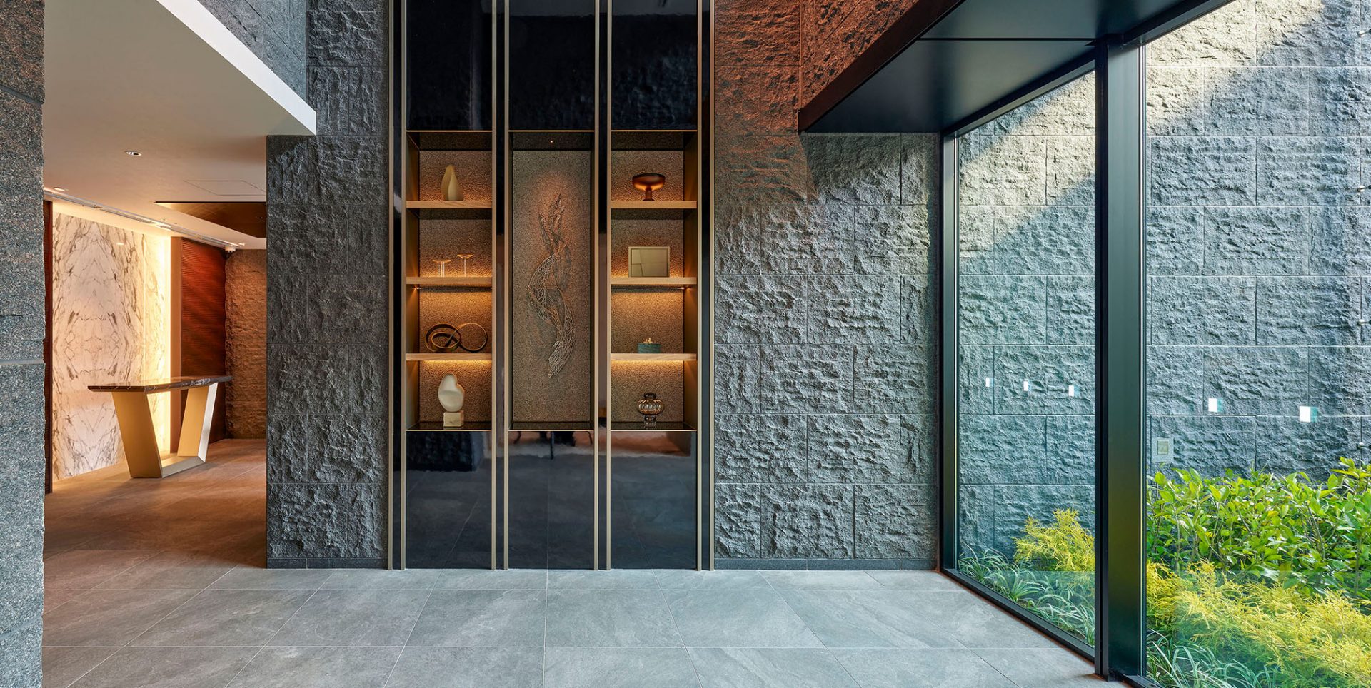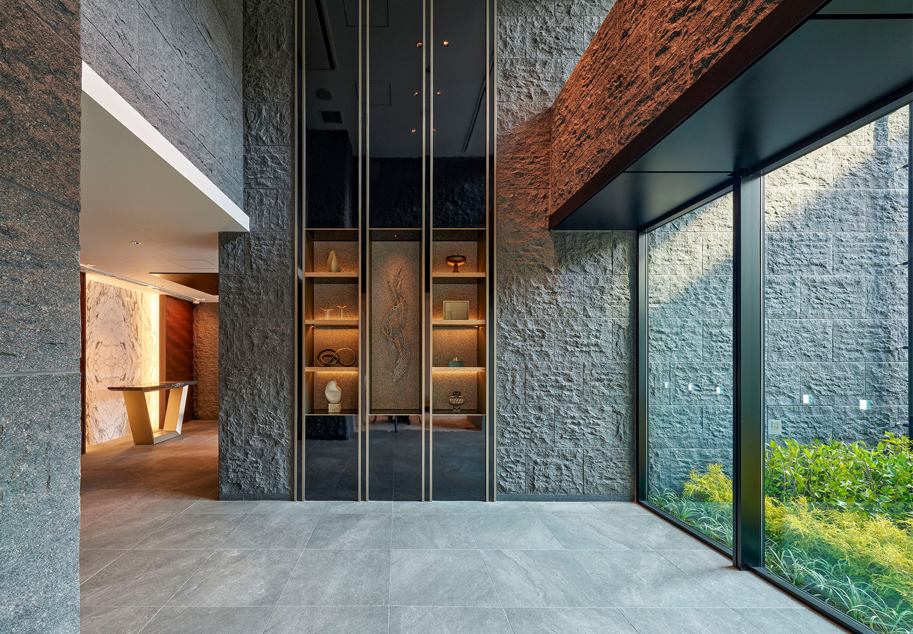 エントランスは「土地の重厚感」をテーマに、上本町を支える台地の力強さを表現。