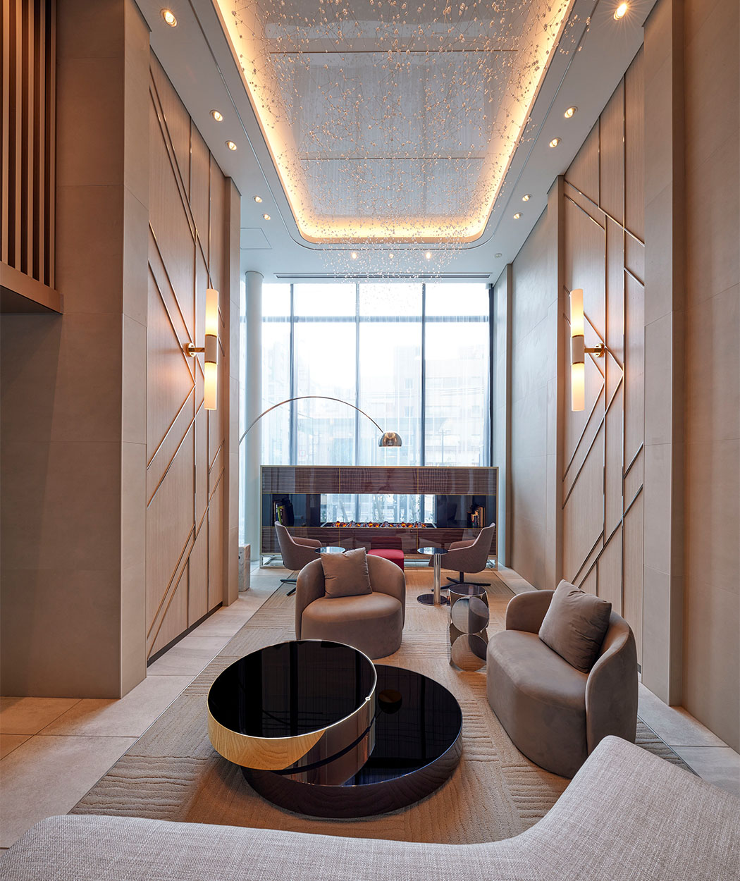 ラウンジは「街の煌めき」をテーマに、ソリッドな素材とメタルの輝きを組み合わせた洗練された空間を創造。